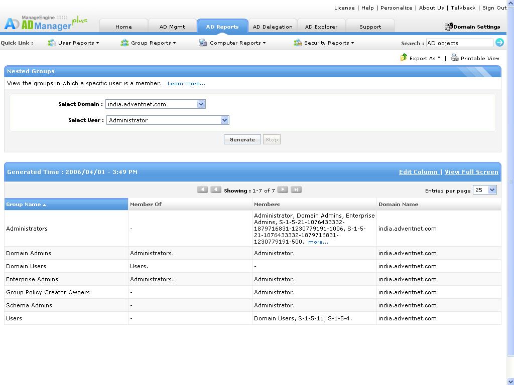 Los informes del grupo de Active Directory le permiten a los administradores obtener una vista rápida de los grupos de seguridad, los grupos de distribución y de los grupos Top N Big en términos de objetos, entre otros, con solo unos pocos clics. Estos informes le evitan tener que escribir scripts para la generación de informes en Active Directory, y esta tarea se simplifica con los informes programables basados en GUI de esta herramienta. Además, esta herramienta simplifica incluso la administración en Active Directory con su capacidad para realizar acciones de administración directamente desde los informes.