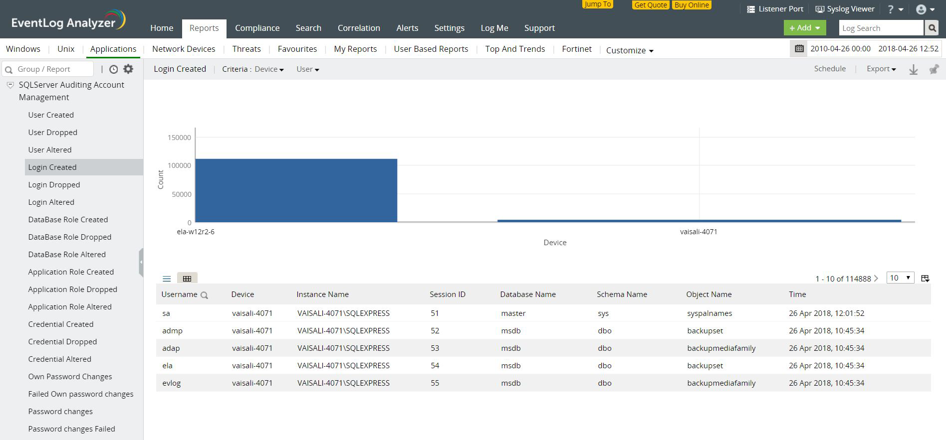 ManageEngine EventLog Analyzer es una herramienta integral de monitoreo de actividades de base de datos que permite monitorear todas las actividades de base de datos, accesos y cambios en cuentas de servidor en su base de datos MS SQL Server.EventLog Analyzer también está totalmente equipado con las siguientes funcionalidades: