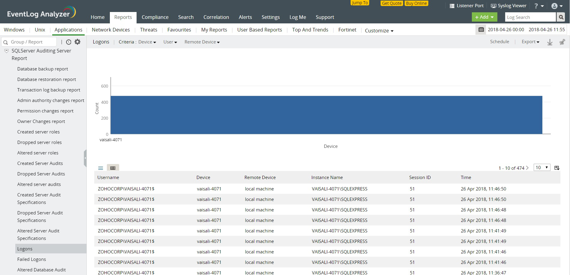 - Con los informes instantáneos de EventLog Analyzer, audite rápidamente las actividades en MS SQL Server como inicio y apagado del sistema, inicio de sesión, fallos en el inicio de sesión, y más.