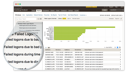 Monitoreo de integridad de archivos Simplifique su análisis sobre los fallos de preautenticación y eventos de errores de inicio de sesión/cierre de sesión y obtenga una mejor visibilidad en su sistema de acceso y autenticación de datos confidenciales con los exhaustivos informes de EventLog Analyzer. La solución ofrece un conjunto de informes sobre los motivos de los errores de inicio de sesión que se producen en su infraestructura de Windows, que incluyen: