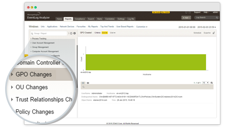 Realice seguimiento y audite sus directivas de grupos y los cambios en las OUs con los informes predefinidos de EventLog Analyzer. Evite las amenazas internas de seguridad lo antes posible detectando el uso indebido de los privilegios de acceso. Conozca quién modifica la configuración de la directiva de grupo o quién crea cuentas de OU/usuario no autorizadas con los informes de gestión de cambios de EventLog Analyzer. Con estos informes, usted podrá saber: