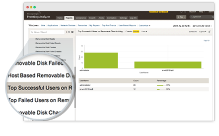 Evite que se filtren los datos confidenciales de la empresa con una auditoría efectiva de los discos extraíbles y del servidor de impresoras. Conozca qué usuario accede al dispositivo USB en qué máquina y cuándo con los informes de auditoría de discos extraíbles. El informe de los eventos más importantes en la auditoría de discos extraíbles proporciona detalles sobre los principales usuarios/hosts que experimentan una alta tasa de transferencia de datos. Sepa: