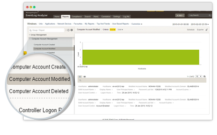 Realice un seguimiento de la administración de las cuentas de computadoras y de la administración de grupos y evite las amenazas de seguridad interna con los informes de administración de cuentas de EventLog Analyzer. Estos informes automatizados no solo le ayudan a auditar su Active Directory en intervalos regulares, sino que también le permiten revisar sus directivas de administración de cuentas, evitando así la pérdida de datos debido a una violación interna de seguridad. Los informes proporcionan información detallada sobre: