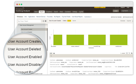 Los informes de administración de cuentas de usuario de EventLog Analyzer le ayudan a realizar un seguimiento y auditar todas las acciones de administración de usuarios. Con estos informes usted podrá saber quién creó una cuenta privilegiada sospechosa, quién está haciendo mal uso de sus derechos privilegiados para modificar las contraseñas de cuentas de usuario y mucho más.