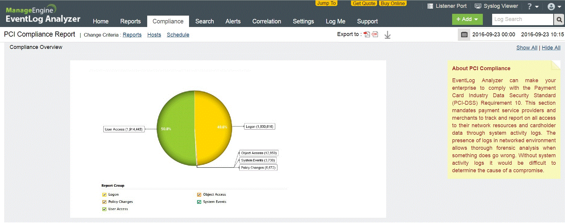 La conformidad regulatoria se ha convertido en la mayor prioridad para los administradores TI. Es fundamental que las organizaciones observen las normas de auditoría de conformidad regulatoria ya que la falta de conformidad con los estándares regulatorios puede resultar en serias penalizaciones. EventLog Analyzer permite a los administradores TI cumplir los requisitos de conformidad regulatoria por medio del monitoreo y análisis de logs de eventos desde sus servidores y workstations Windows servers en tiempo real.