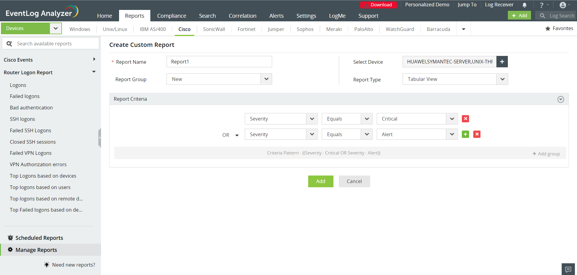 EventLog Analyzer permite usar varios criterios para generar informes personalizados en sus datos de log de eventos generados en máquinas Windows. Los criterios son: mensaje de log, usuario, ID de evento y tipo/gravedad del evento.