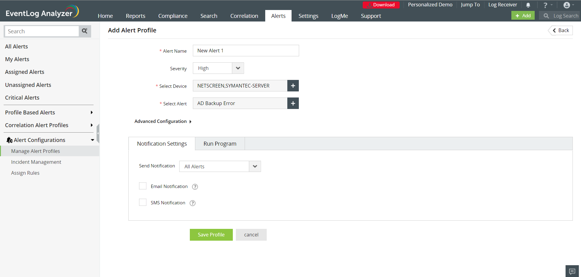 EventLog Analyzer genera alertas en tiempo real en logs de eventos, y notifica a los administradores cuando se genera un evento que coincide con un criterio específico. Las alertas ayudan a los administradores a supervisar servidores y procesos críticos en la red de Windows en tiempo real.