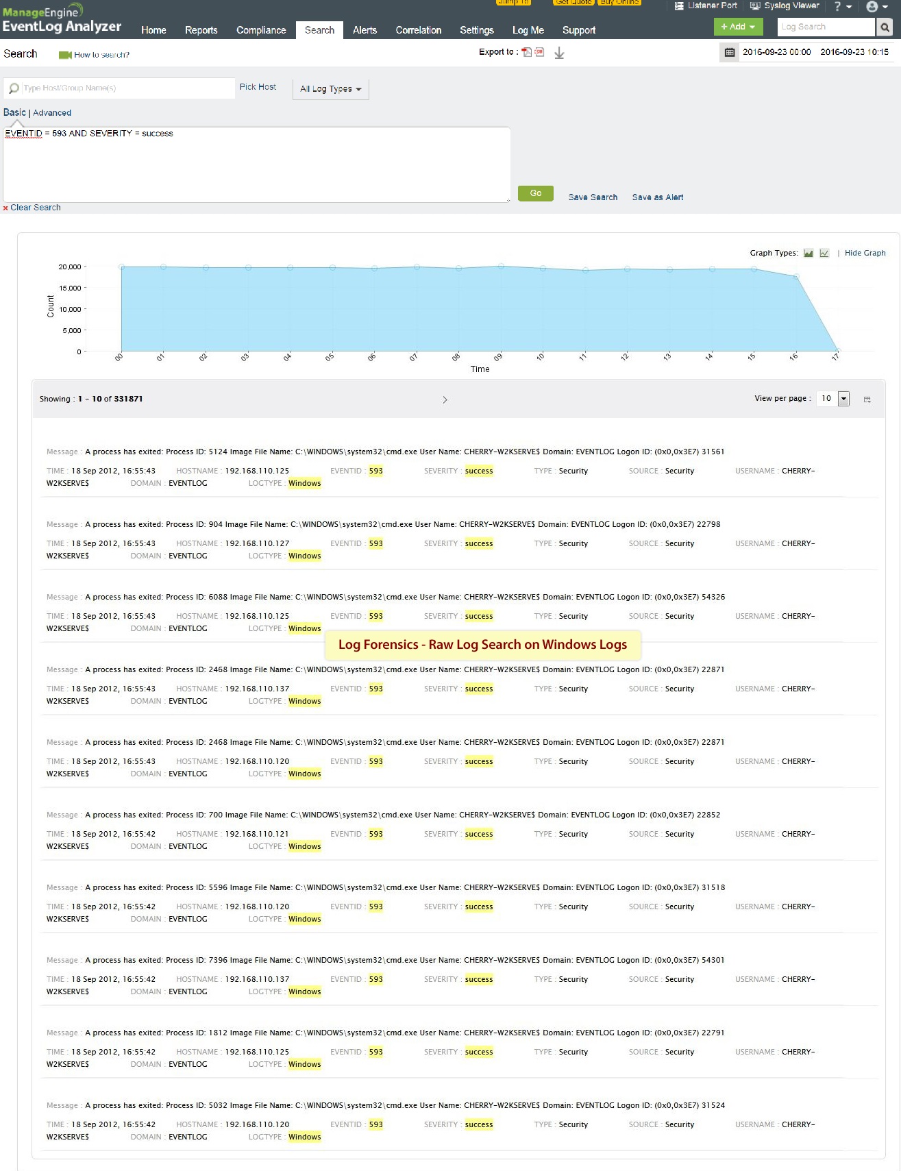 EventLog Analyzer facilita la investigación forense de log de eventos permitiendo el uso de su potente motor de búsqueda para buscar en logs de eventos sin procesar y formateados y generar instantáneamente informes forenses con base en los resultados de búsqueda. Los administradores de red ahora pueden buscar logs de eventos sin procesar e identificar el ingreso exacto en el log que causó la actividad de seguridad, encontrar la hora exacta en la que sucedió en evento de seguridad correspondiente, quién inició la actividad y también la ubicación desde donde se originó la actividad.