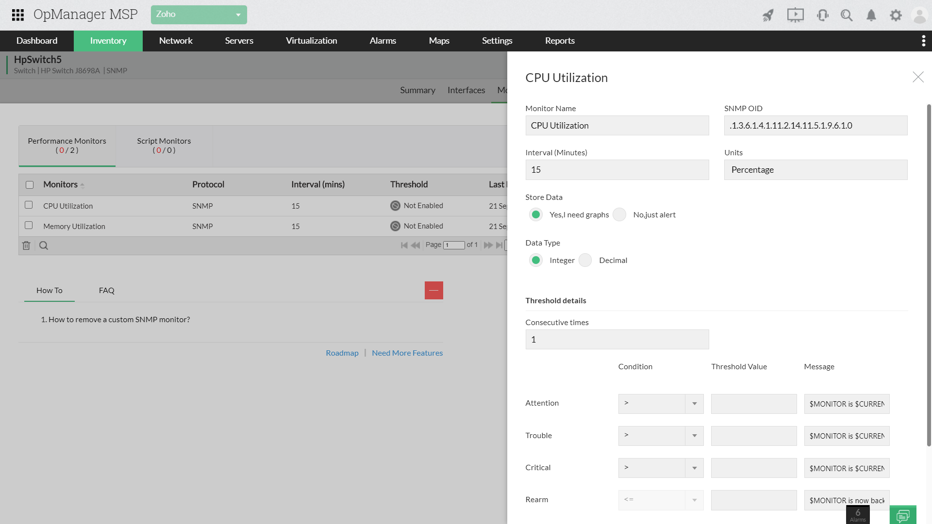 Con OpManager MSP, usted puede detectar proactivamente todos los eventos que podrían impactar el desempeño de las redes de sus clientes. El software de servicios gestionados de OpManager identifica eventos que emplean técnicas de monitoreo activo y pasivo. El monitoreo activo involucra la asignación de umbrales multi nivel para monitores de desempeño y verificar vulneraciones de esos umbrales. El monitoreo pasivo involucra el análisis de syslog, logs de eventos de Windows y traps de SNMP generados de dispositivos defectuosos.