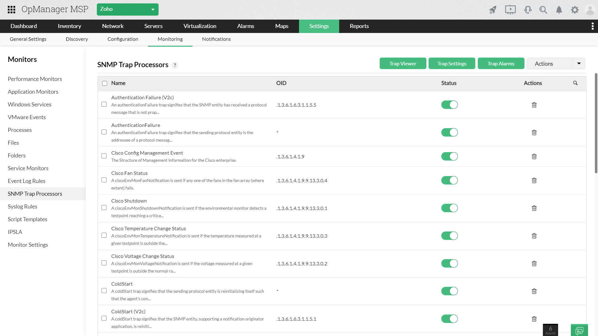 OpManager MSP es un robusto software para la gestión de fallas de red específicamente diseñado para permitir que los MSP ofrezcan una detección vanguardista de fallas y servicios de resolución de problemas. Con OpManager MSP, usted puede identificar todos los eventos, aísle estos eventos/fallas que impactan negativamente las redes de los clientes, genere y disemine alertas mediante notificaciones correo electrónico/SMS y resuelva problemas de fallas identificadas.