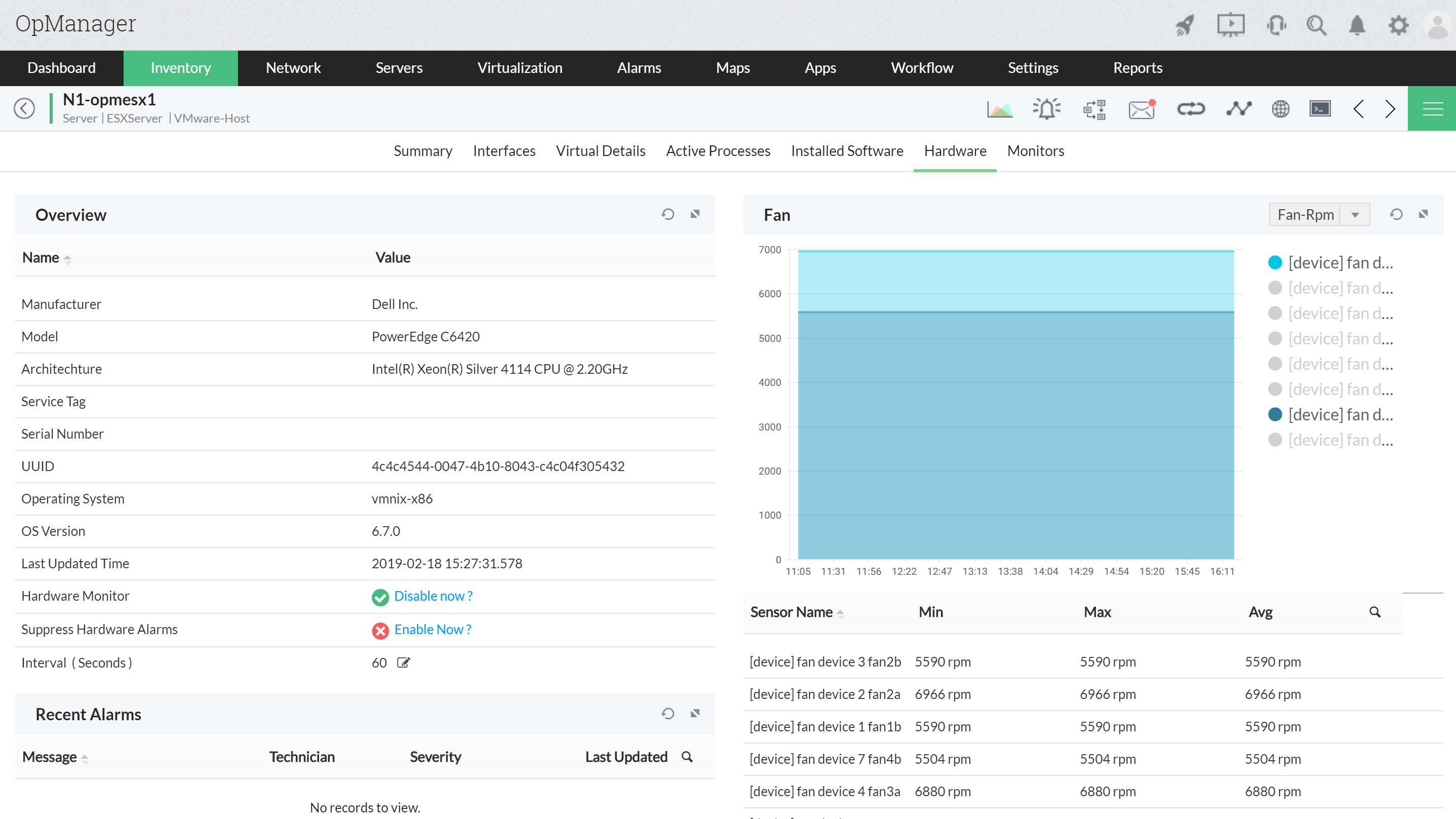 Obtenga información en tiempo real sobre el estado del hardware monitoreado, como servidores, routers, switches, firewalls, equipos virtuales y dispositivos de almacenamiento. Esta información se presenta en forma de tablas y gráficos.