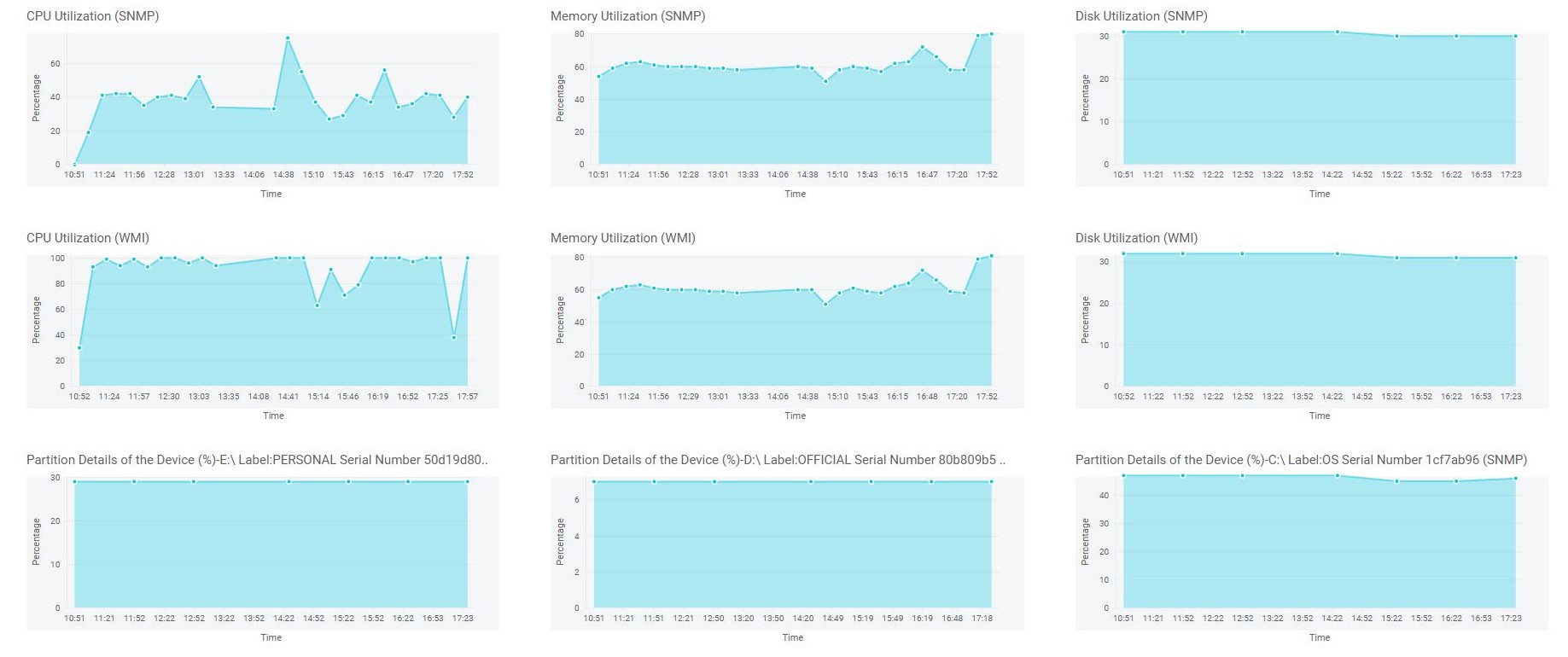 Además de monitorear la temperatura, la velocidad del ventilador, la fuente de alimentación, etc., OpManager también ayuda a monitorear otro hardware como la CPU, la memoria y los discos. Estos son recursos críticos que suministran energía a los servicios y monitorear más de 25 métricas diferentes de la CPU, la memoria y el disco (como la utilización, la velocidad, el tiempo de inactividad, las I/O de lectura y escritura, el espacio libre, la cola del procesador, entre otros) puede proporcionarle la visibilidad que necesita para mantener la cargas de trabajo críticas mientras se mantiene el máximo rendimiento.