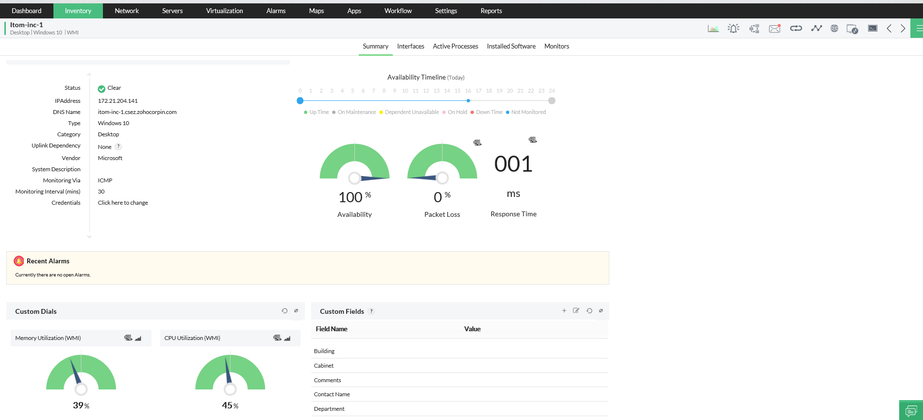 Ya que cada minuto de inactividad puede costarle miles, o millones de dólares, es crucial mantener la disponibilidad en todo momento. OpManager hace ping a todos los dispositivos monitoreados en los intervalos definidos, y si algún dispositivo está inactivo o si el tiempo de respuesta o la pérdida de paquetes son demasiado extensos, OpManager lo notificará de inmediato por medio de un correo electrónico o mensaje de texto.