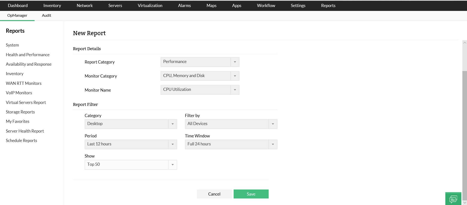 También puede crear informes personalizados con OpManager.