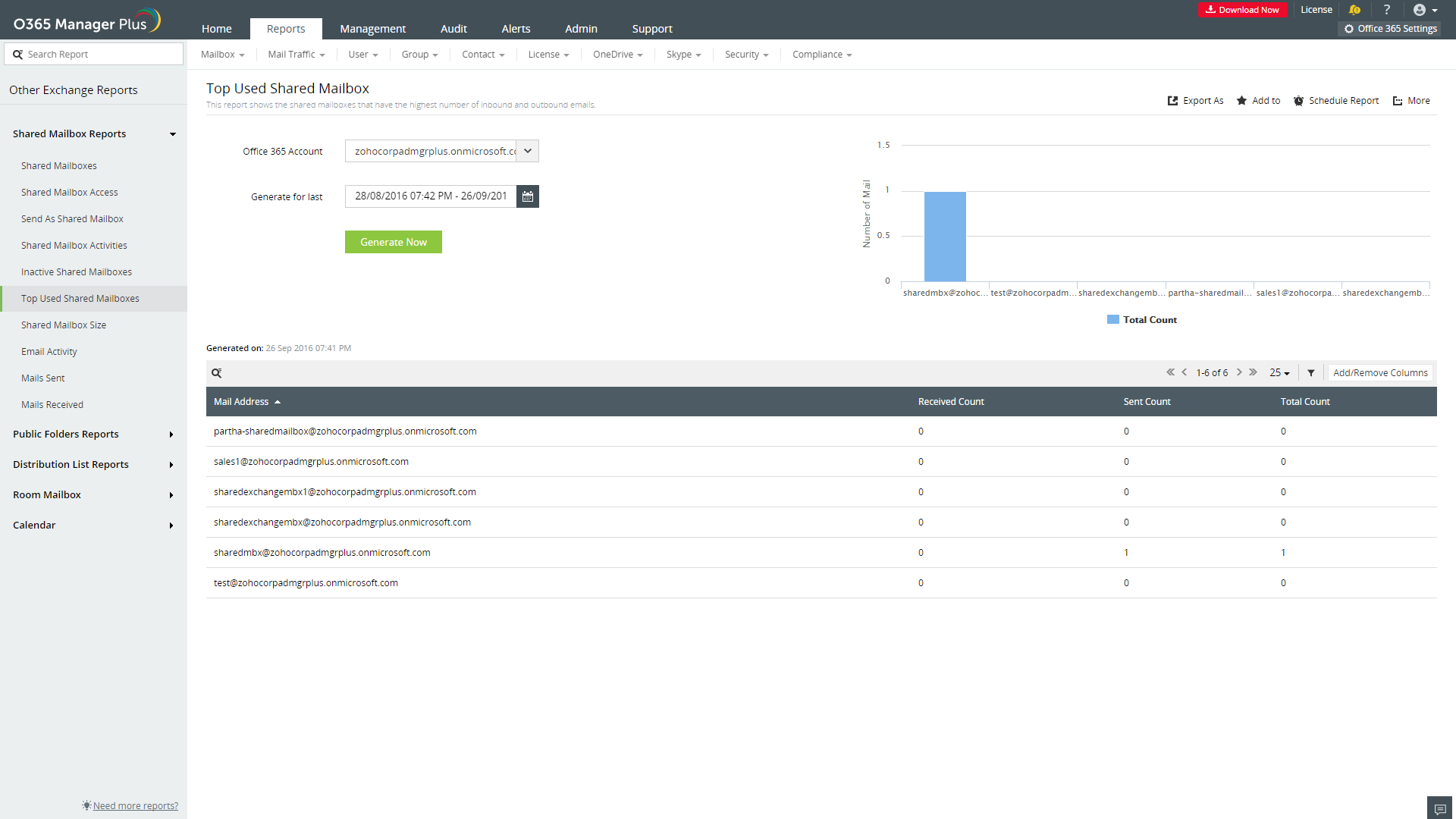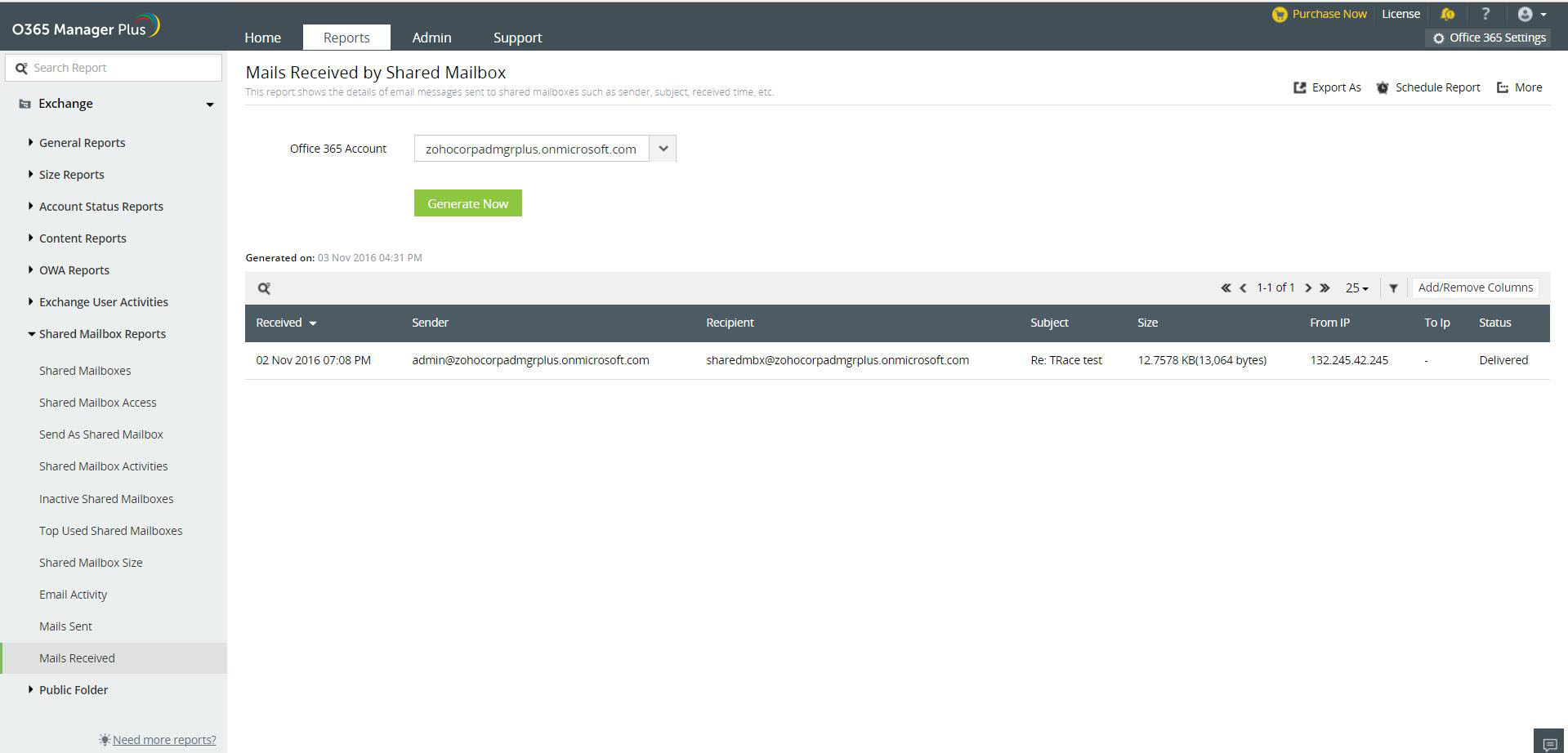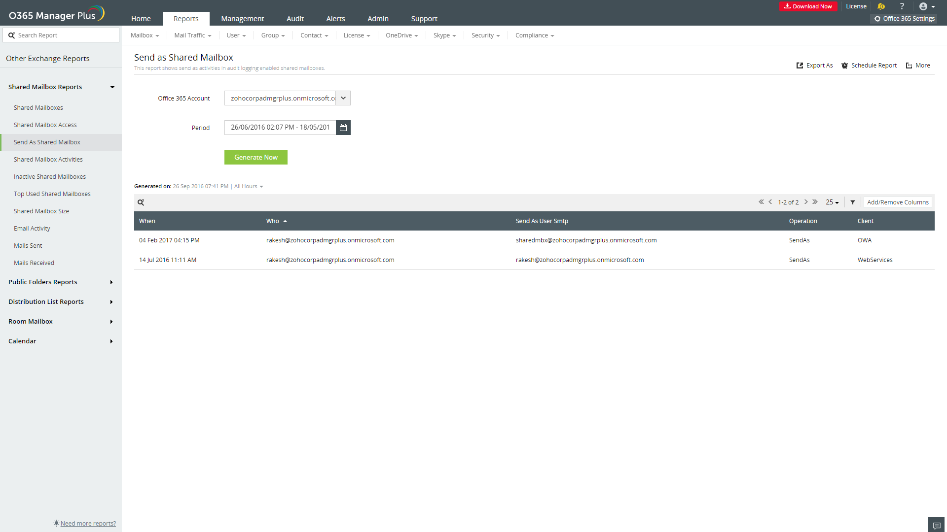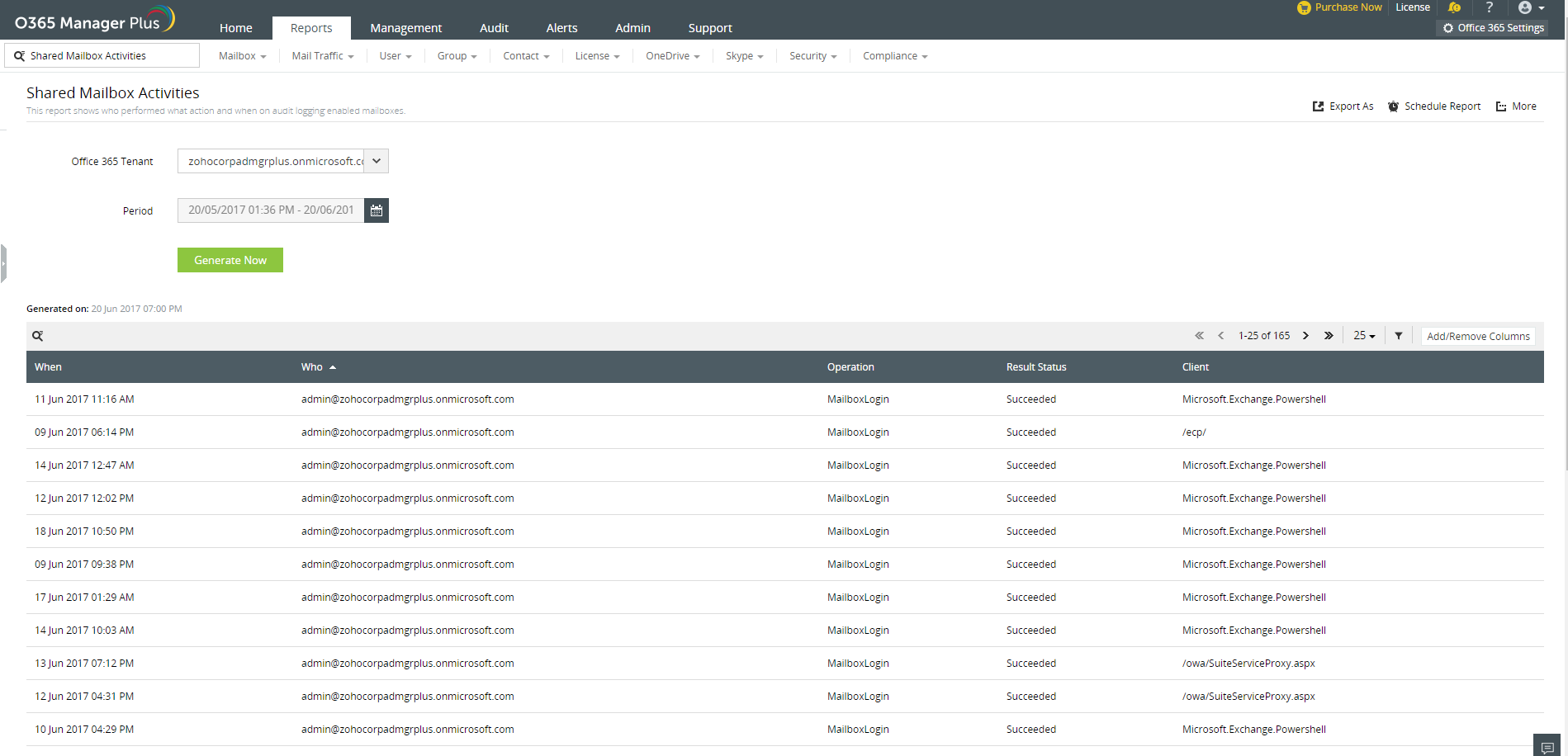 Los usuarios con derecho de enviar como pueden enviar correos desde otra dirección de email y que parezca que fue enviado desde el buzón compartido. Este informe de O365 Manager Plus muestra cuáles usuarios han usado este derecho, cuándo lo usaron, la dirección del cliente IP, y más, en la duración especificada.