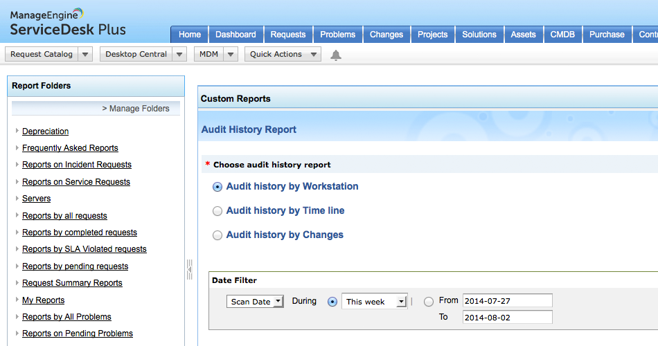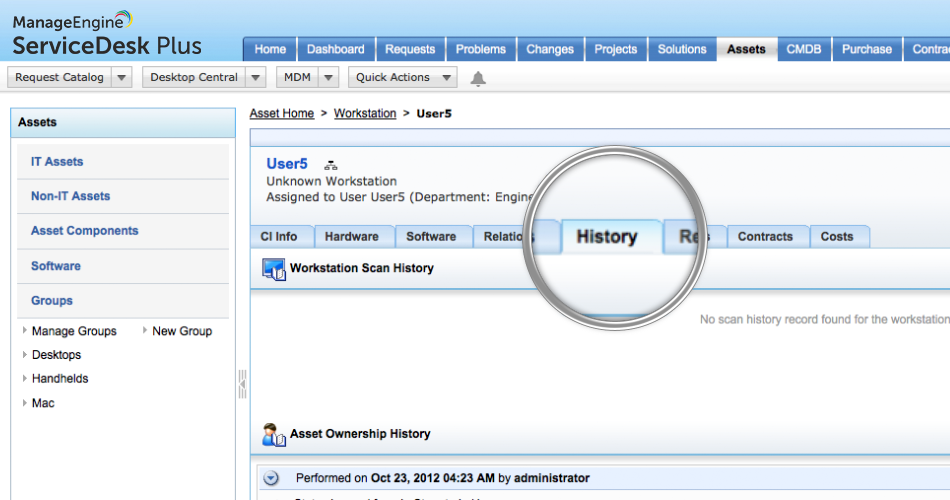 Desde el proceso de adquisición de un activo hasta que se lo deja de utilizar, todos los activos que forman parte de su entorno TI sufren una variedad de cambios durante su ciclo de vida. El seguimiento de estos cambios no es una tarea fácil si no se cuenta con una herramienta adecuada como ServiceDesk Plus. Esta herramienta permite llevar a cabo actividades de seguimiento de sus activos. ServiceDesk Plus ofrece una solución simple para la administración de activos, el seguimiento de cambios, la realización periódica de auditorías, y la generación de informes para brindarle datos robustos y un control absoluto de su entorno TI.