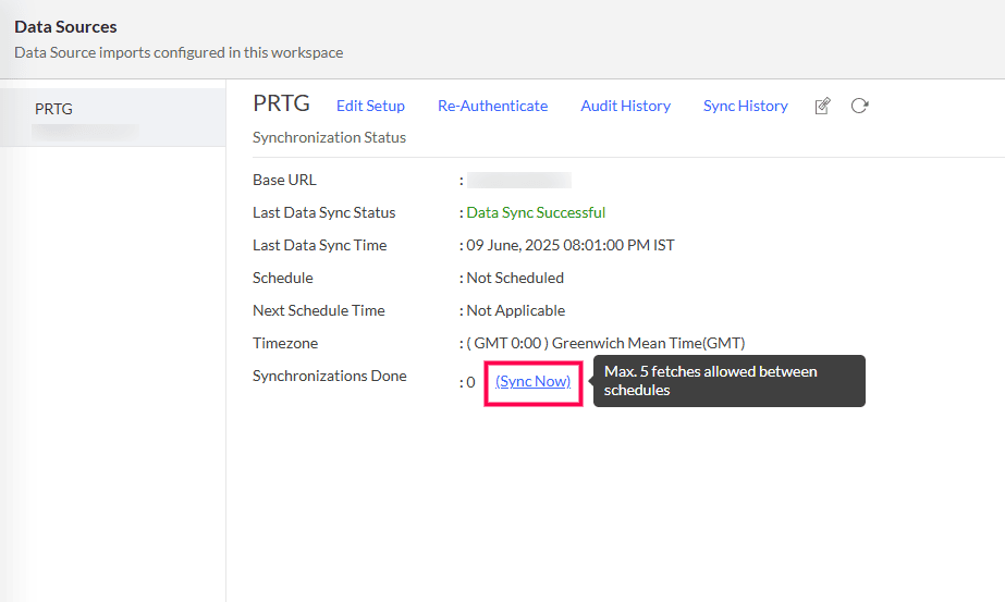 The import or synchronization process of your PRTG data can sometimes fail if PRTG's credentials are changed, or if the application is moved to a different server. To resolve this, click the Data Sources option from the side panel and click the Re-Authenticate link. In the popup that appears, click Authenticate PRTG. Enter the Username, password and Access Token and click the Authenticate PRTG button.