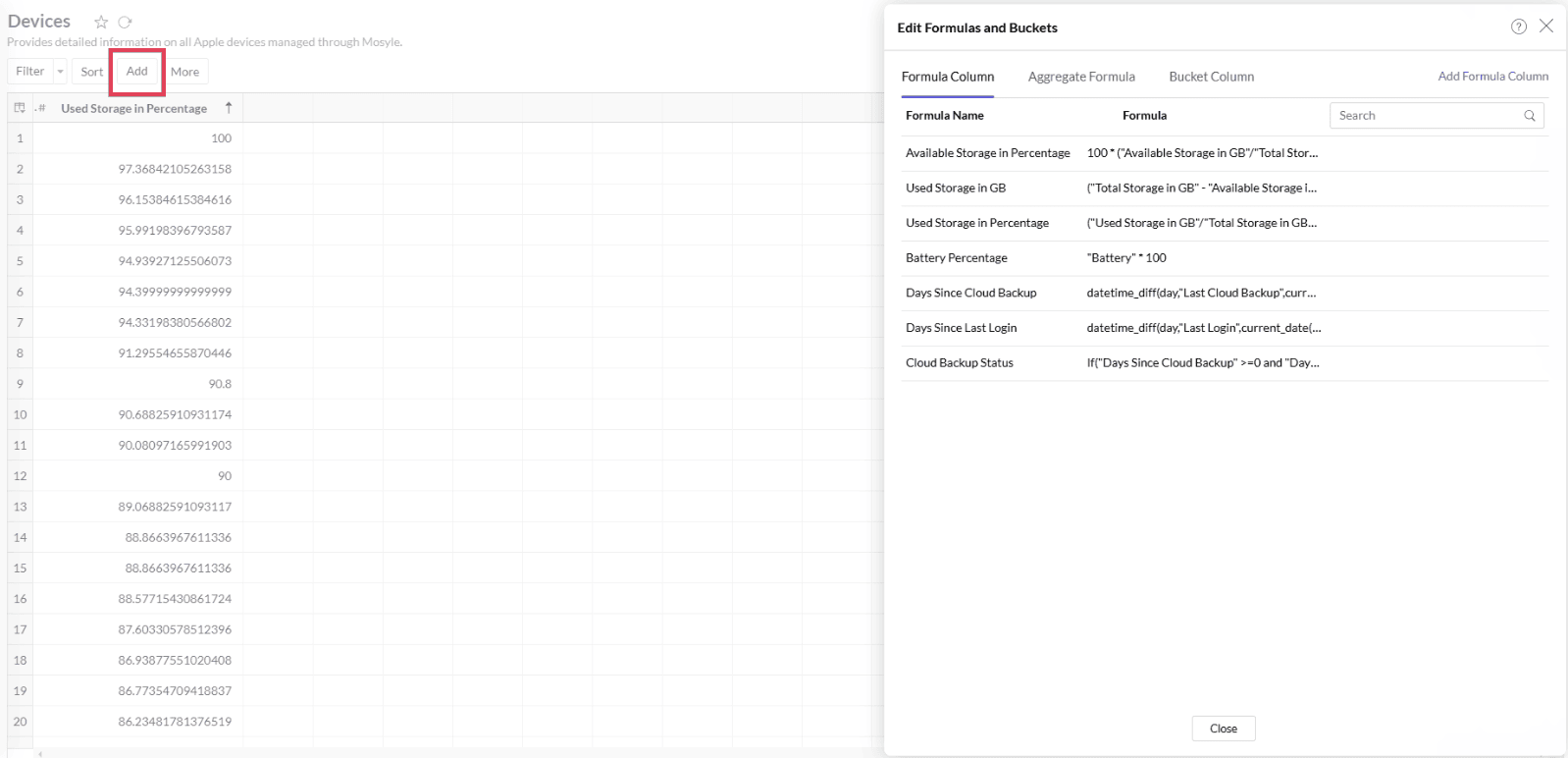 Formulas are calculations that can be defined using the powerful formula engine to create required reports. Refer this documentation to know more. There are also several default formulas created based on the PRTG modules. To view the default formulas, open the required table, click Add, and select the Edit Formulas option.
