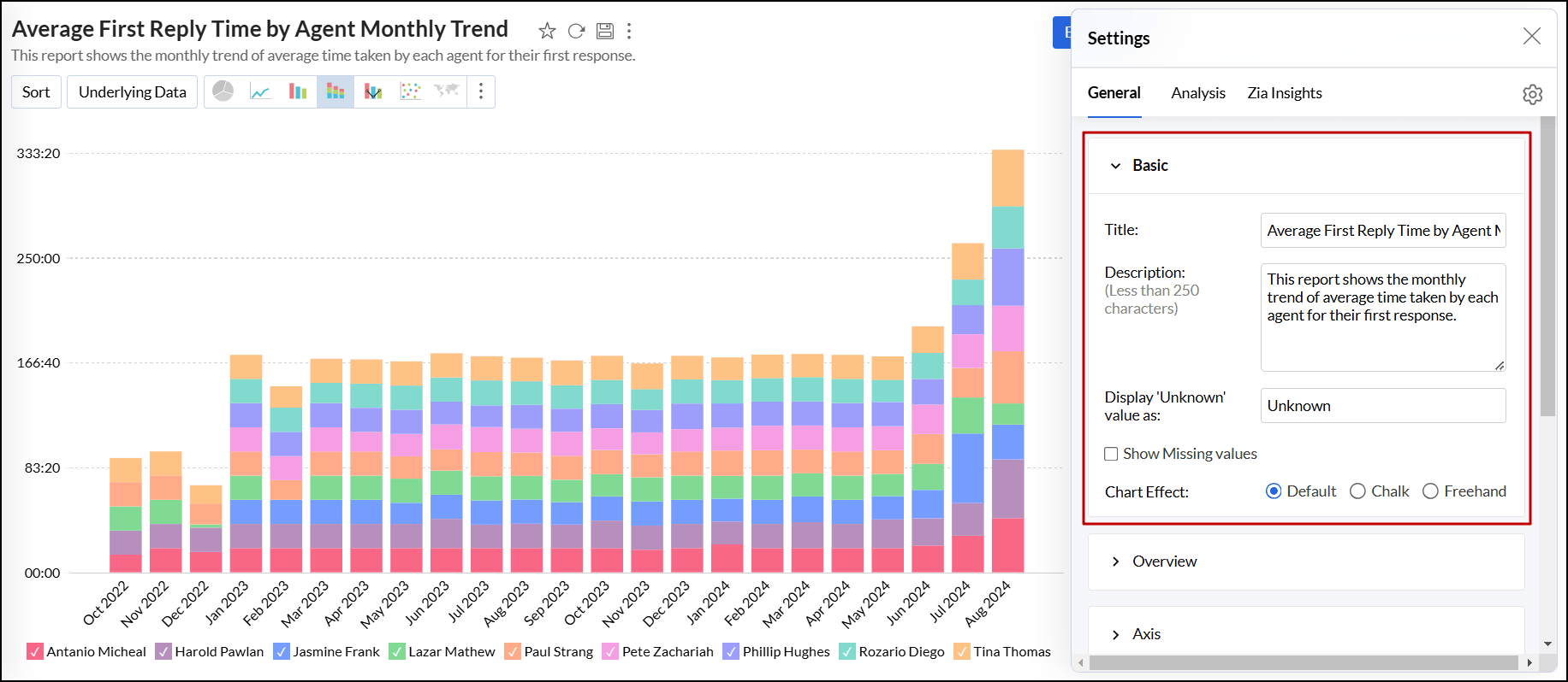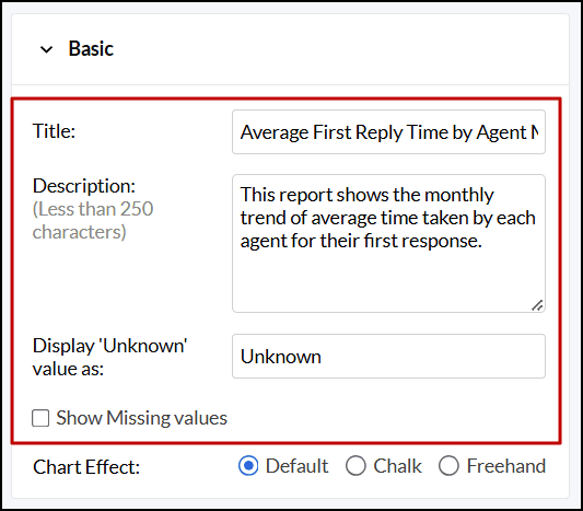 This section lets you customize the elementary details of the report, such as the Title, Description, representing Missing values, and other chart-specific options.