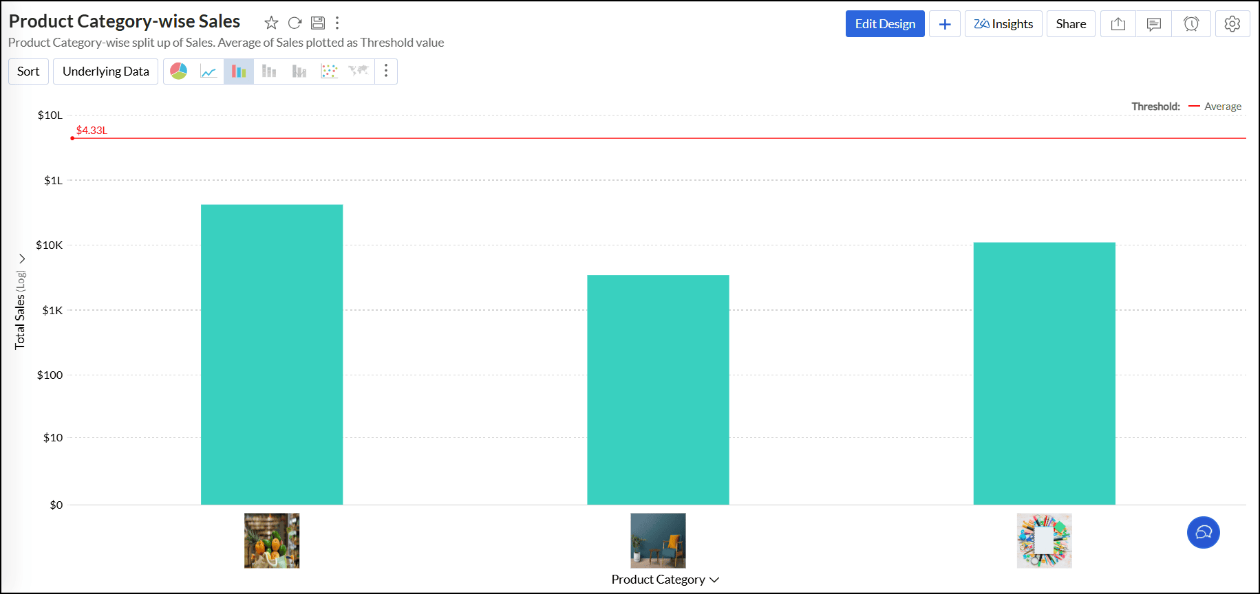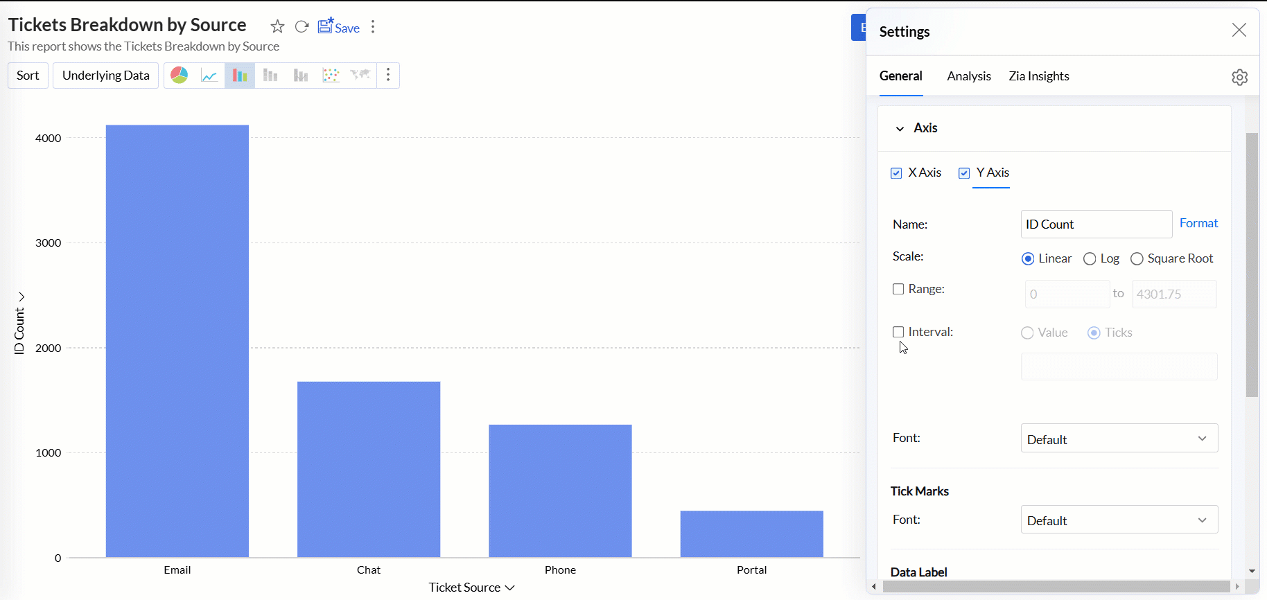 Analytics Plus automatically sets values for chart axes (X-axis and Y-axis) such as labels, axis range, interval between labels, etc. You can also customize these properties as required.
