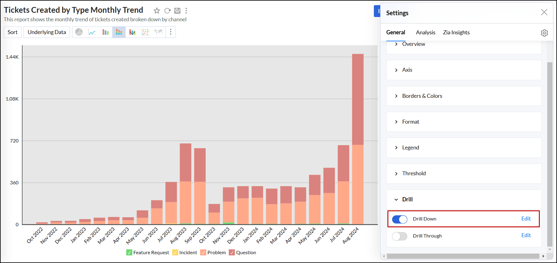 - Drill Down: Deselect this to remove the drill down option from your chart completely.
