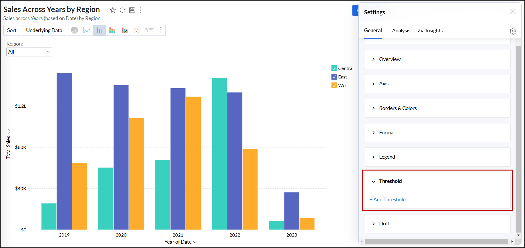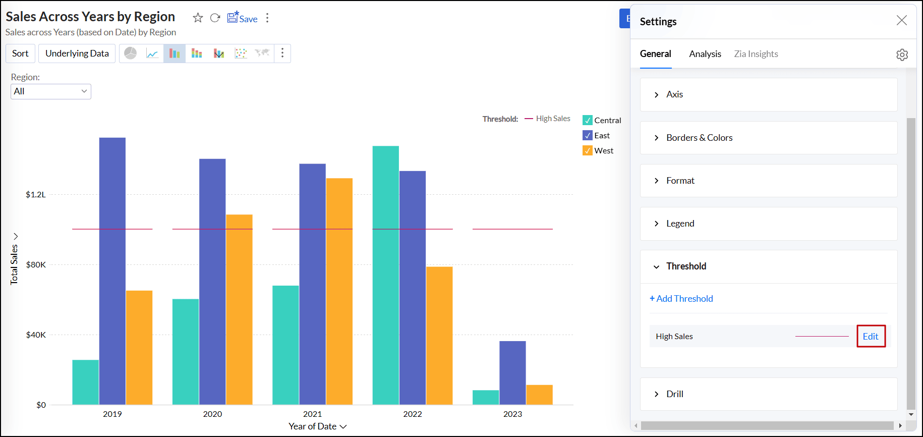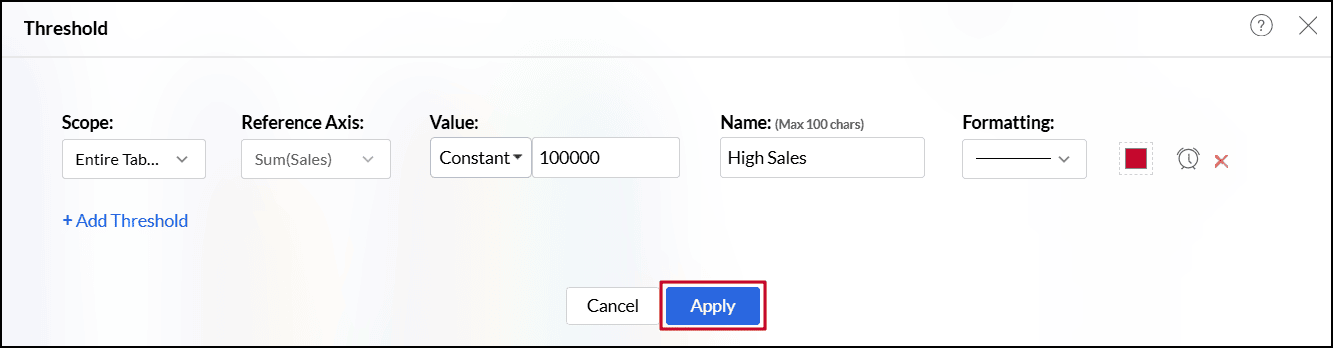 A threshold is a predefined value or limit that is used to highlight specific data points or regions within the chart. It helps visually distinguish values that meet or exceed a certain threshold. Threshold lines can be added horizontally or vertically at a fixed value on the X or Y-axis of a chart. Analytics Plus enables you to set two types of thresholds.