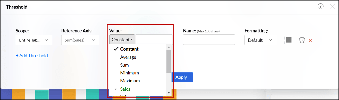 - A dynamic threshold is a reference line drawn to represent computed values such as the minimum, maximum, average, or sum of columns in your reference axis. To add a dynamic threshold line, select a function from the Value drop-down.