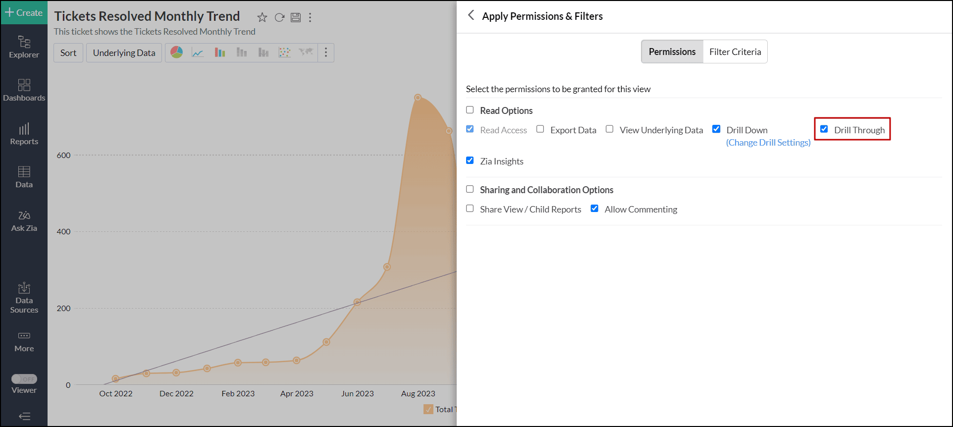 While sharing views, Analytics Plus allows report owners to enable the Drill Through option, granting other users the ability to drill through the related views.