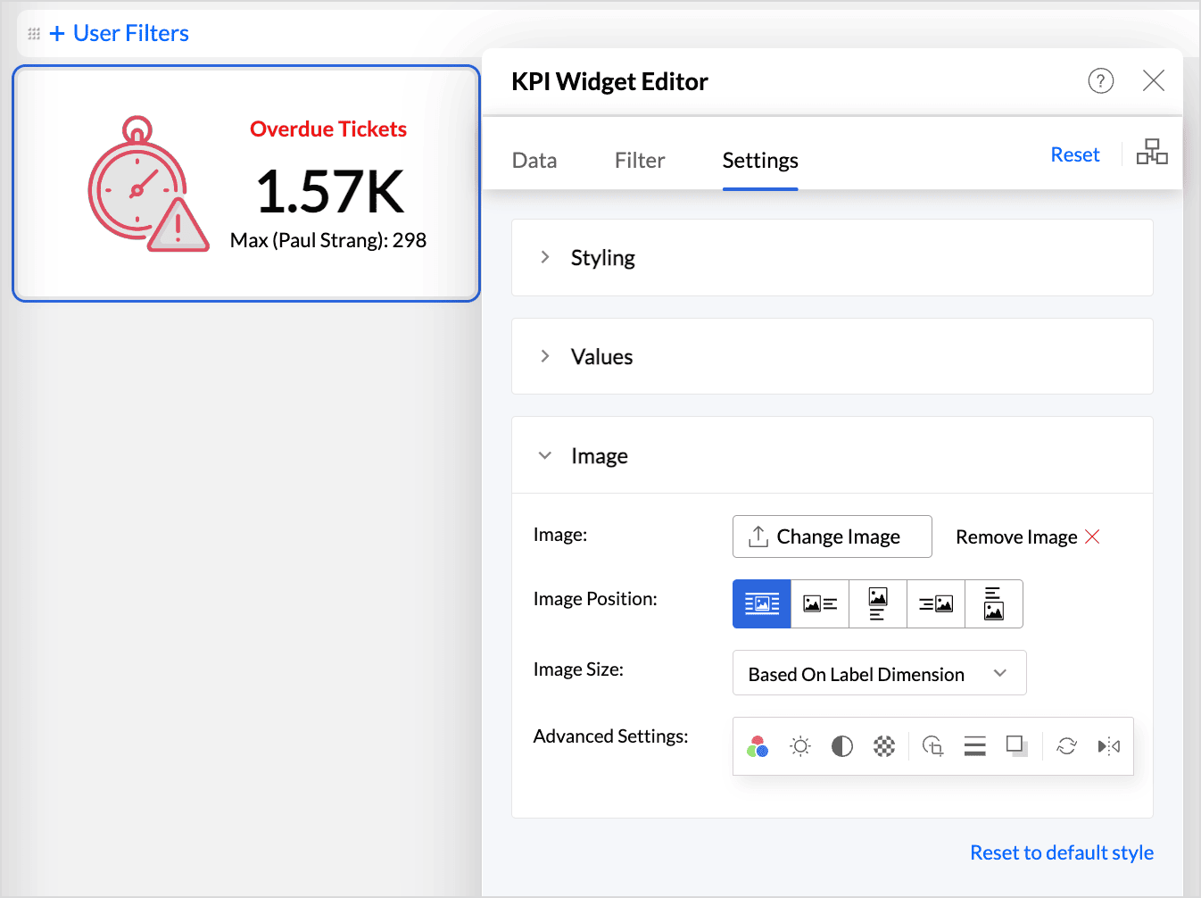 To revert any changes made to the image or icon, click the Reset to default style link at the bottom of the image editor.