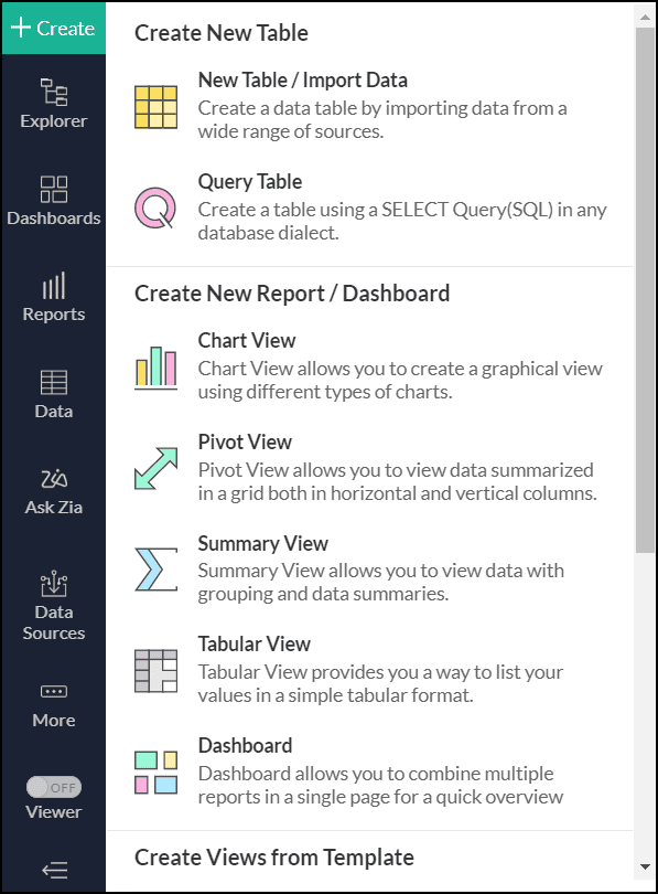 Analytics Plus supports a wide variety of reports, in the form of charts, pivot tables, summary views and tabular views. To learn more about the various types of reports click here. To know more about dashboards and KPI widgets, click here.