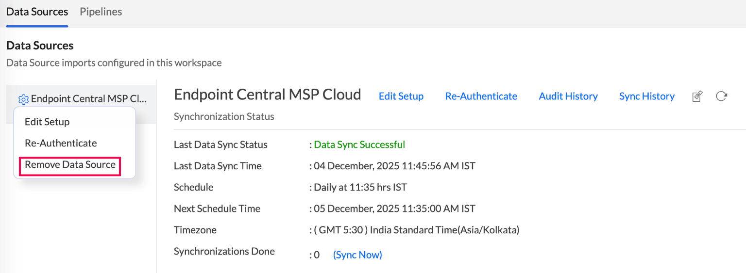 Yes. To do this, click the Data Sources option from the side panel. In the page that appears, navigate to the Endpoint Central MSP Cloud source and click the corresponding Sync Now button. You can also access the Endpoint Central MSP Cloud data source page, and click Sync Now.