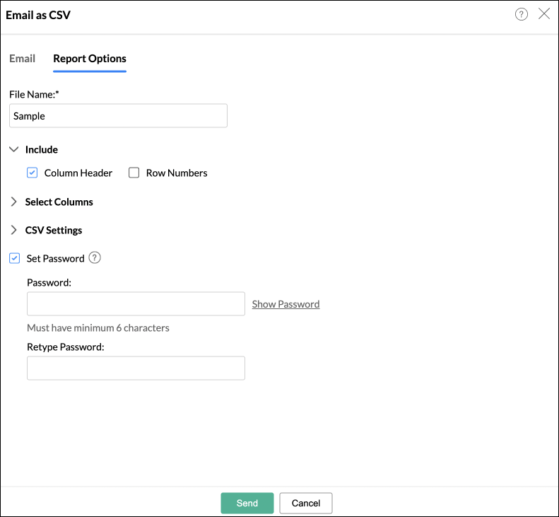 • You can Set Password to password protect your email attachments. Select Report Options tab under the Settings window. Select the Set Password checkbox to enter the password for your e-mail attachment. Analytics Plus does not offer options to share your password through the application interface. It has to be shared with users separately.