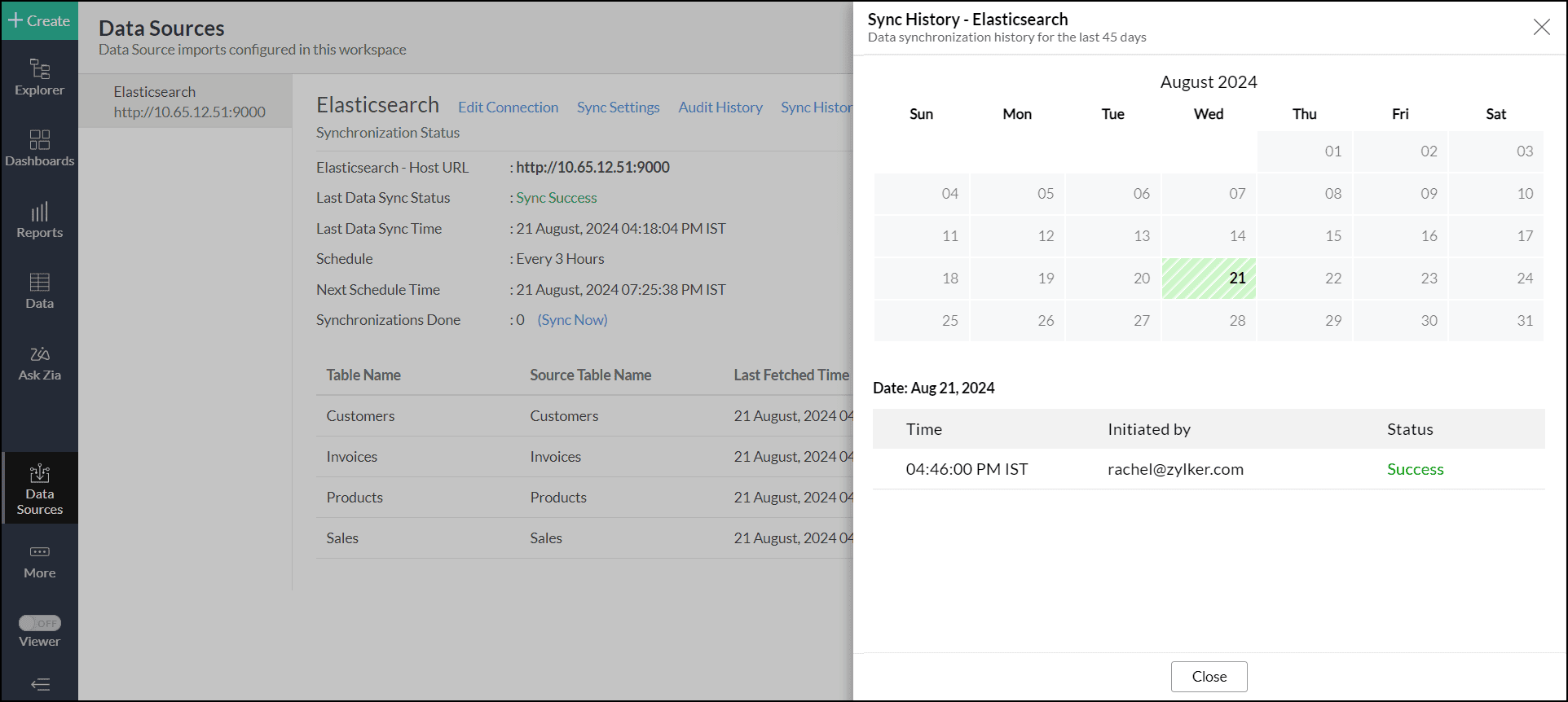 Analytics Plus provides a detailed record of all actions performed with respect to data synchronization from various sources. The history captures the type of action performed along with the timestamp and information about the administrator who performed it.
