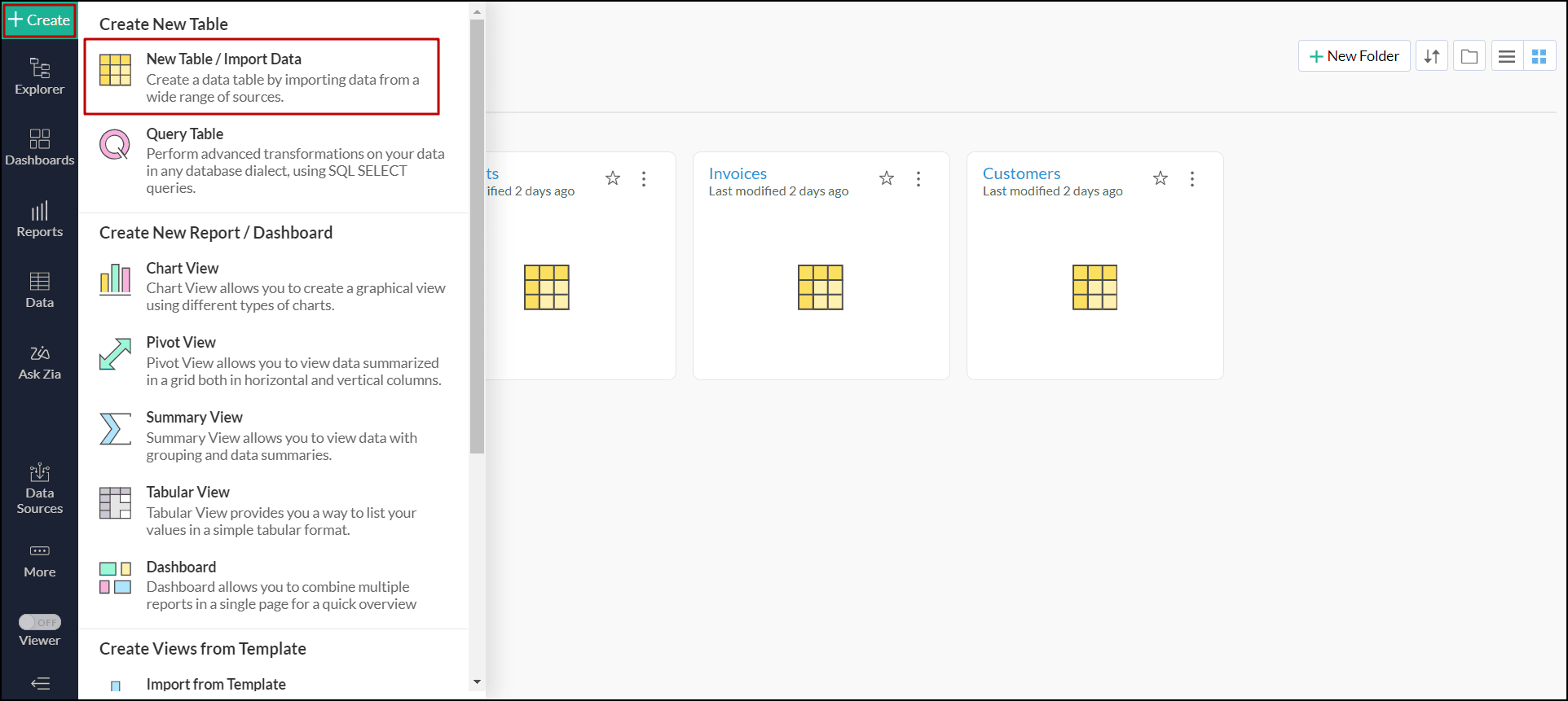 Click + Create from the side panel, and select the New Table / Import Data option.