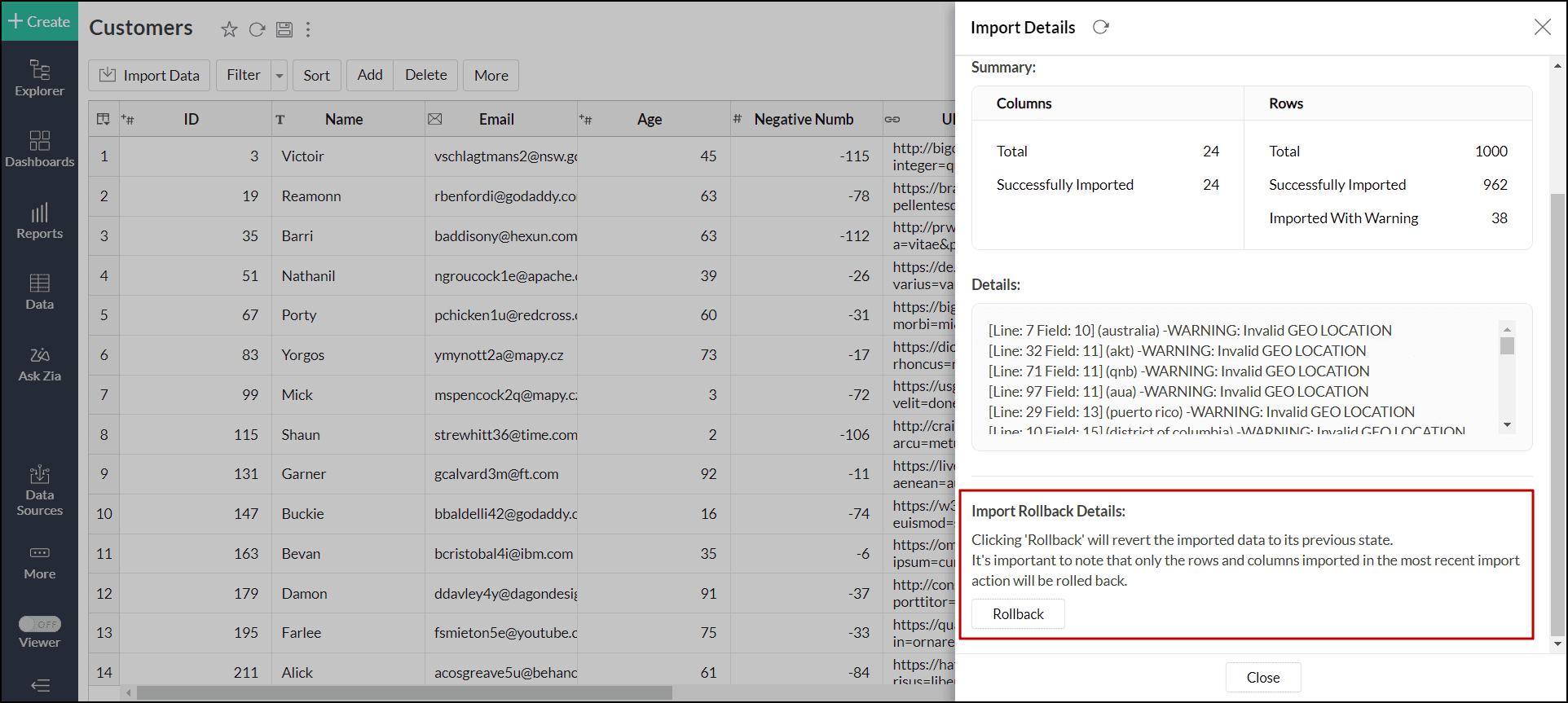 - Any actions, such as adding a new column, creating formulas, formatting columns, and having lookups defined, will be preserved during the import rollback.