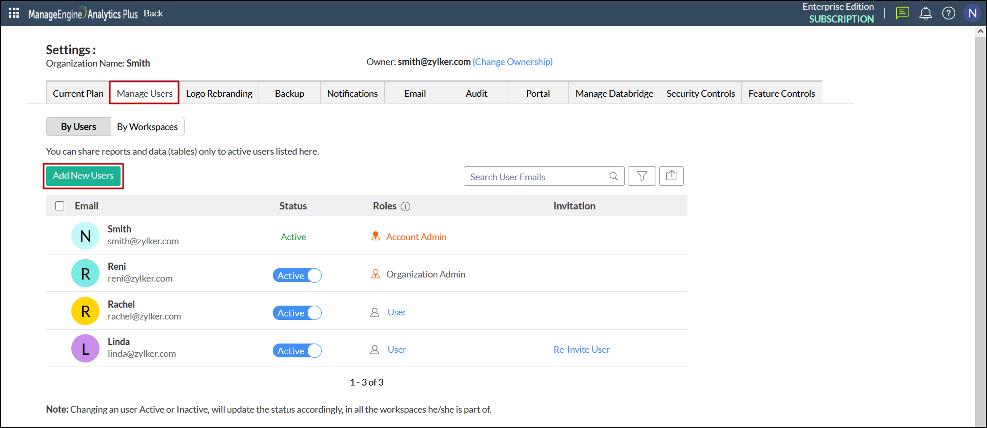 Analytics Plus allows you to add users either by sharing a view or workspace or adding users manually from the Manage Users tab.