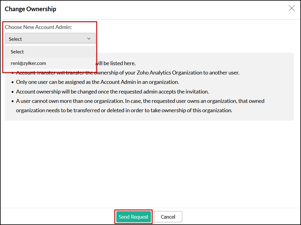 In the dialog that appears, choose the new account admin email from the Choose New Account Admin drop-down and click Send Request. An account transfer request will be sent to the specified administrator, and the account will be transferred to the new user on accepting the request.
