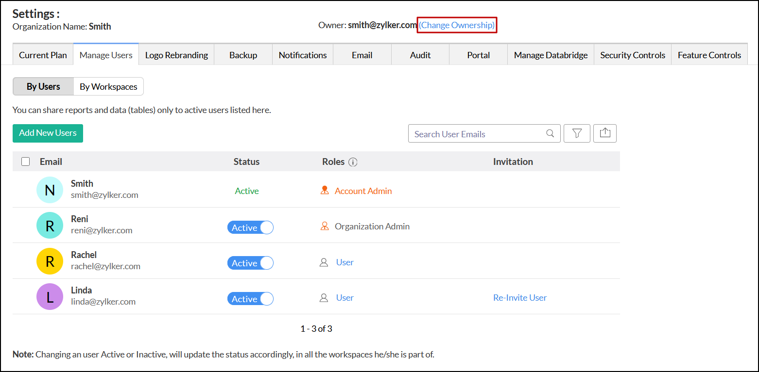 Analytics Plus allows you to categorize your users as Organization Admin, Workspace Admin, User, Viewer or assign a Custom Role. Click here to learn more about the various user roles and access privileges.