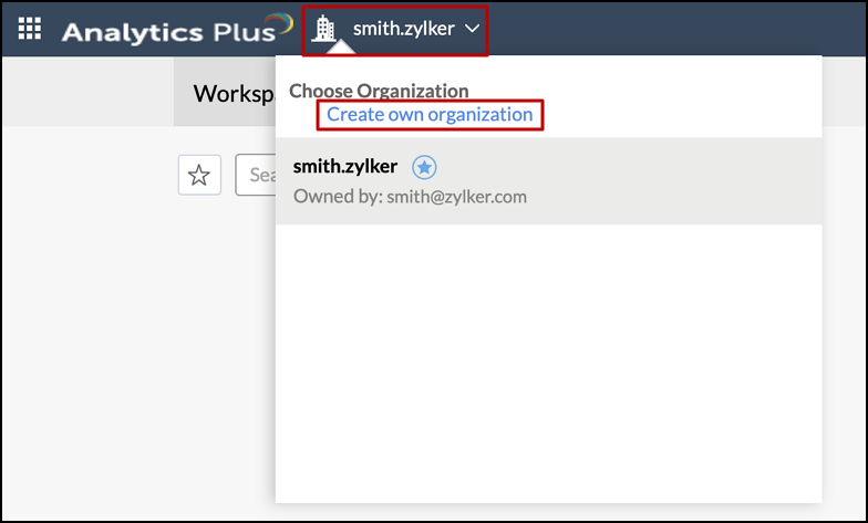 When you are already a part of another organization before signing up for Analytics plus, an organization for your account will not be created.This typically happens when another Analytics Plus user shares reports or dashboards with you. However, you can create your organization by clicking the Organization icon (in the top menu in the homepage)> Create own organization link.