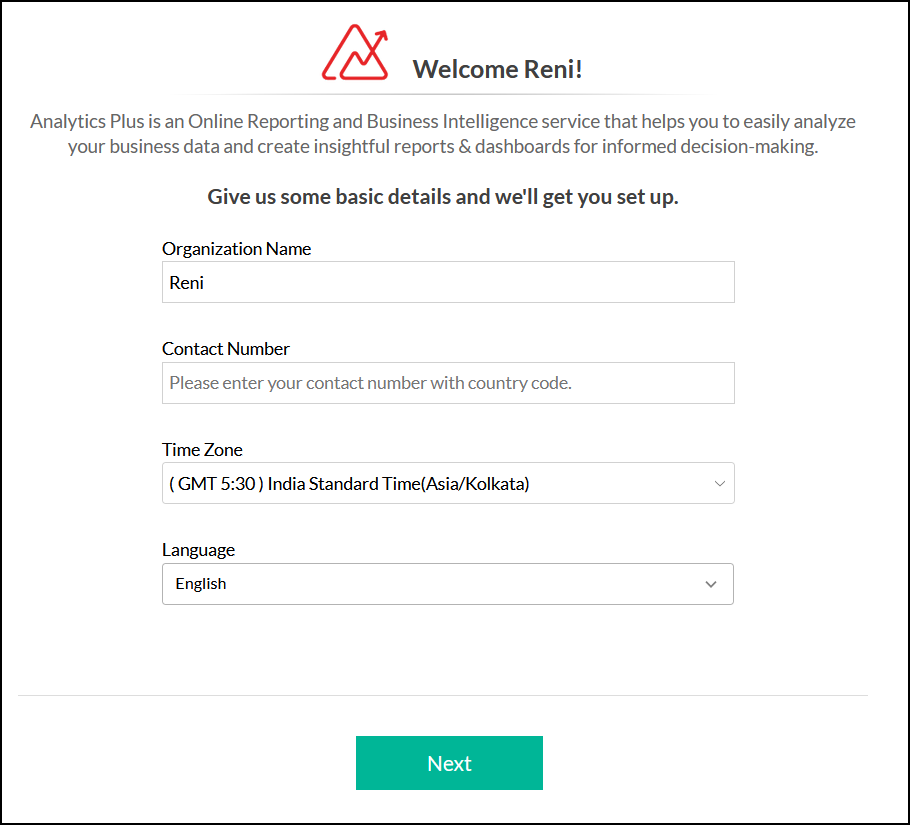 When you are not part of any other organization before signing up, Analytics Plus prompts you to create an organization as soon as you sign up.
