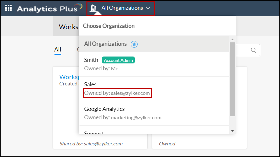 To access all the workspaces of the organization you own and are a part of, click the All Organizations option.