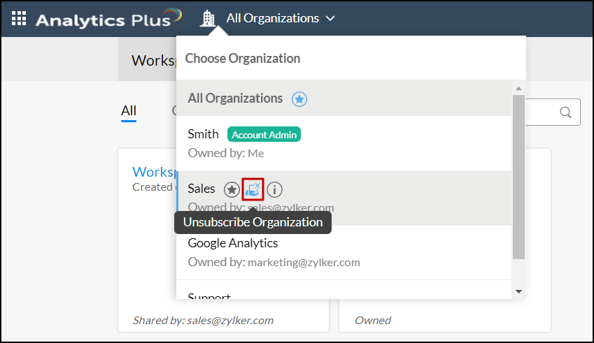 Yes. Analytics Plus allows you to unsubscribe from a shared organization. Click the Organization icon > Unsubscribe Organization icon that appears on mouse over the required organization name. Click Yes to confirm the unsubscribe action when prompted.