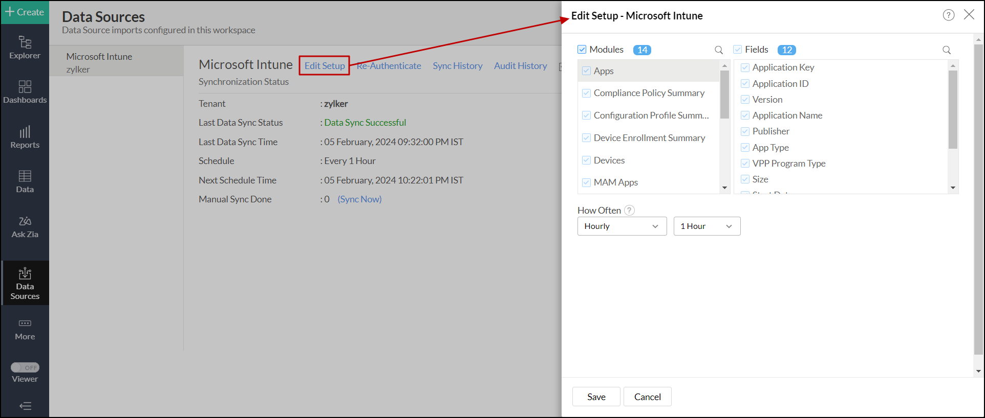 - Navigate to the Microsoft Intune data source, and click the Edit Setup link.