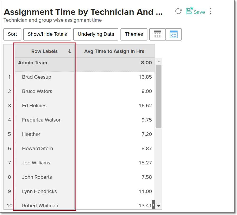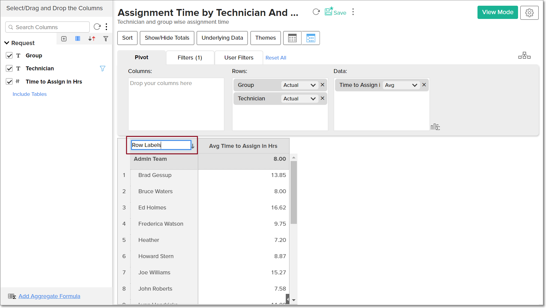 Note: The compact column that displays the values dropped in the Row shelf will be named Row Labels. To modify the name, in the Edit Design mode of the pivot, navigate to the Row Label column and click the Edit icon that appears near the column name on mouse over. Modify the name as needed, and hit Enter.