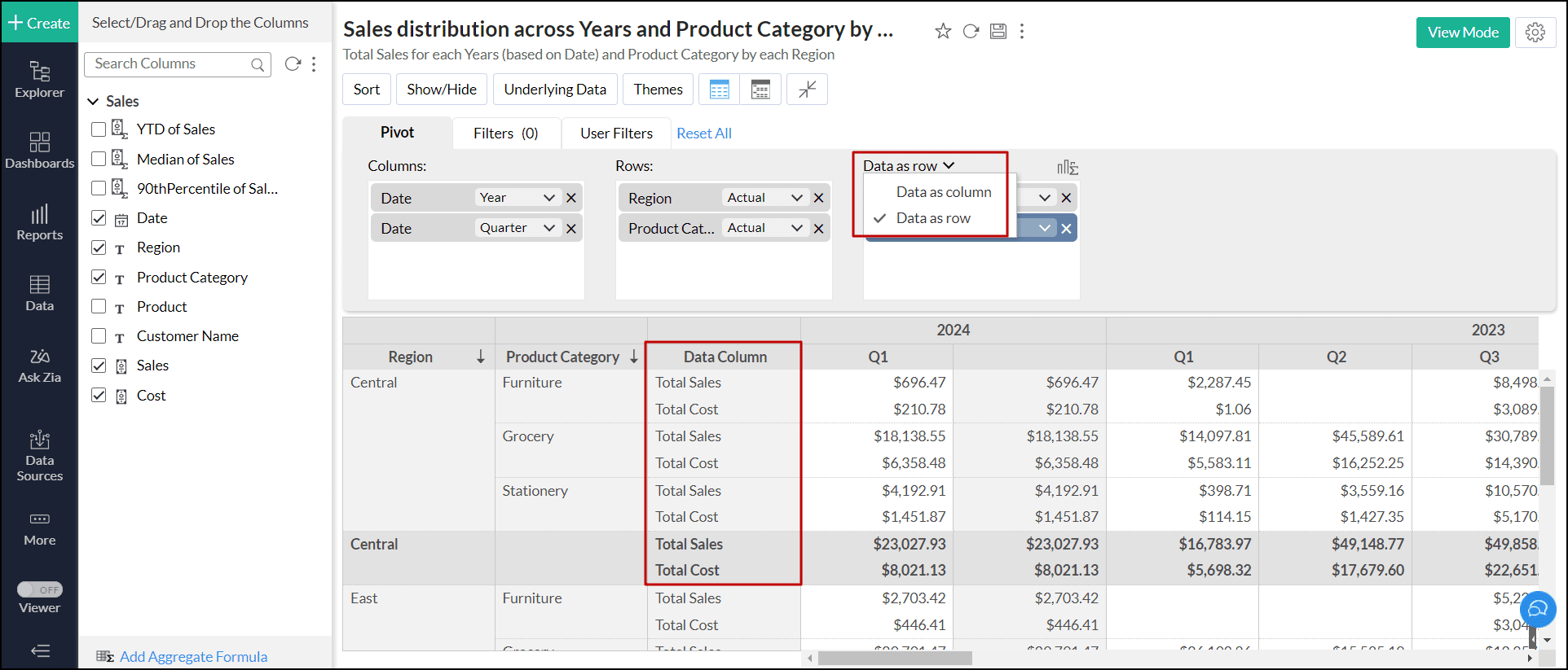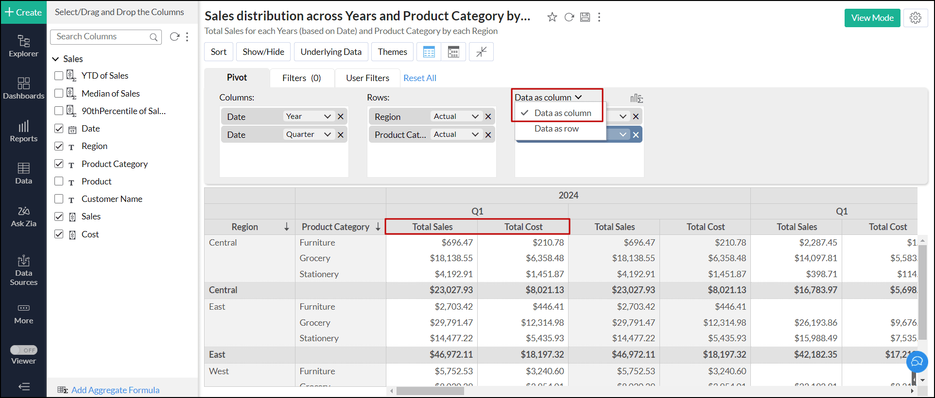 The Data as row option is applicable only when multiple columns are added to the data shelf. Selecting the Data as row option will transform all the total columns as rows under the column header Data Column. However, you can rename the column header as required by double-clicking it. In the below image, Total Sales and Total Cost are expressed in Data as row format.