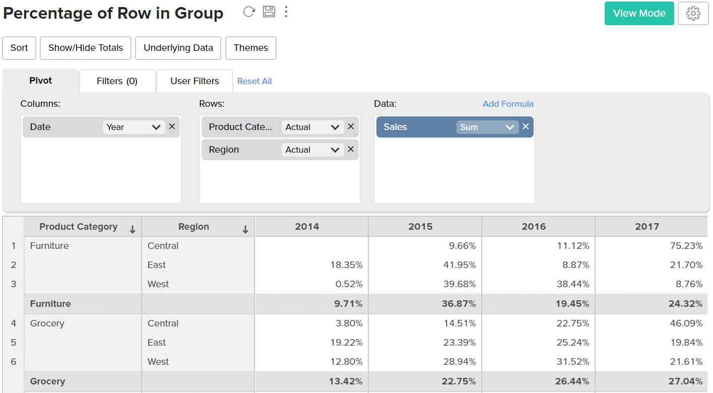 For instance if you want to Summarizing data like finding the average sales of each product by product category in each region, select Average function from the drop-down list for Sales (Data) column and then click Click here to Generate Pivot link or View Mode button in the toolbar.