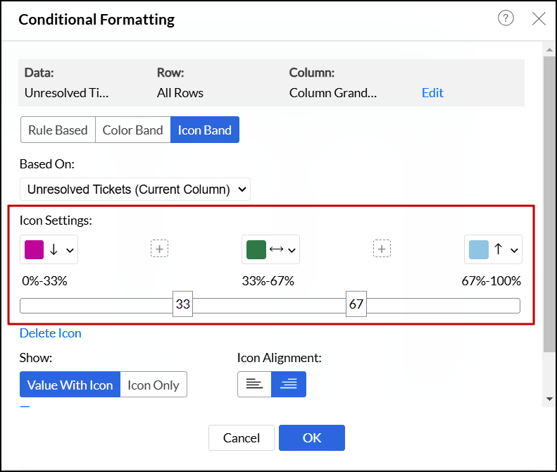 • Icon Only: This option displays only the icon without the data value. You can align the icon to the left, middle, or right within the cell.