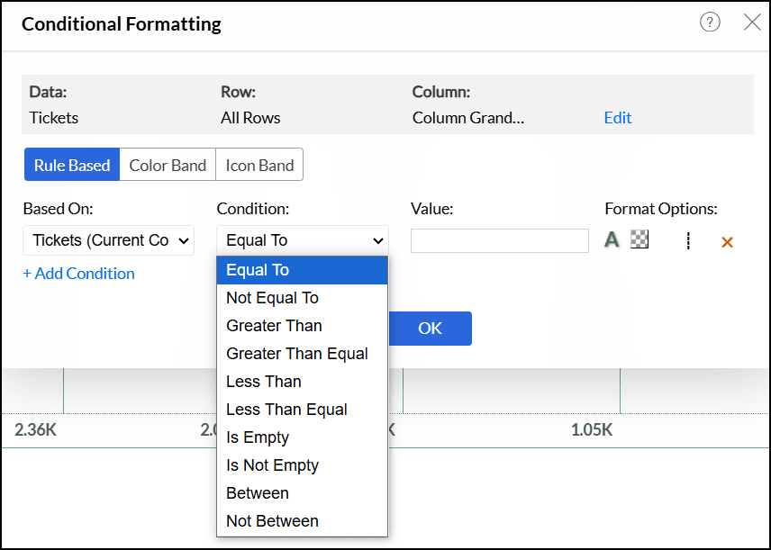 4. In the popup that appears, select the required condition from the Condition drop-down. The available conditions vary based on the type of data being formatted.