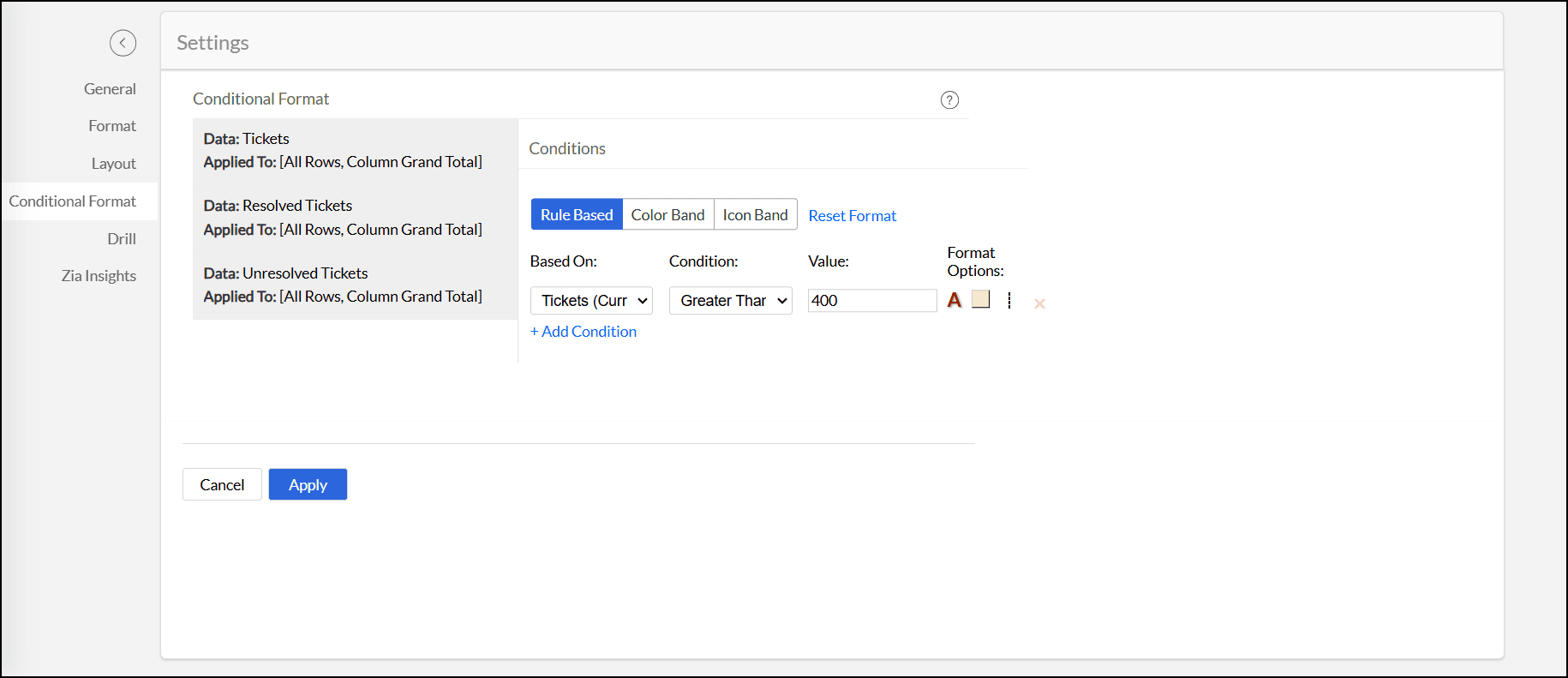 Analytics Plus lets you view and modify the conditional formats applied over the pivot view, from the Conditional Format tab of the Pivot's Settings page. Click the required data to view the corresponding conditional formats applied over it. Modify the conditions as required, and click Apply.