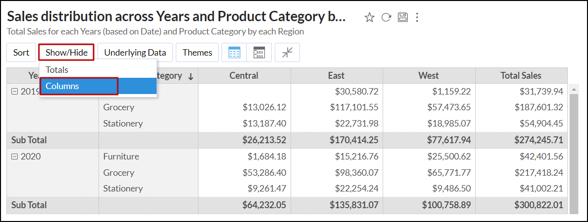 Analytics Plus lets you show or hide specific columns and totals in the pivot table.
